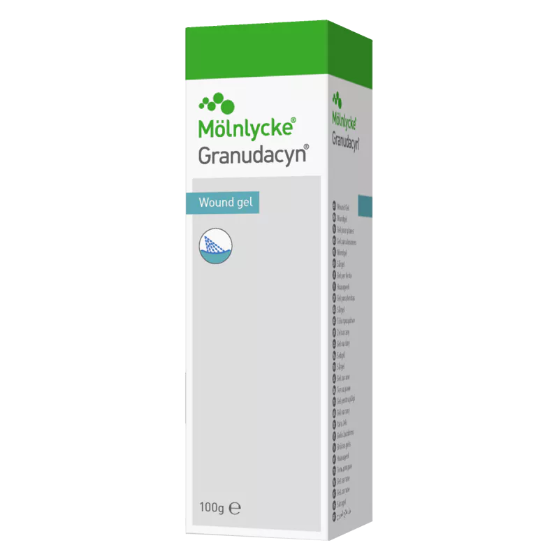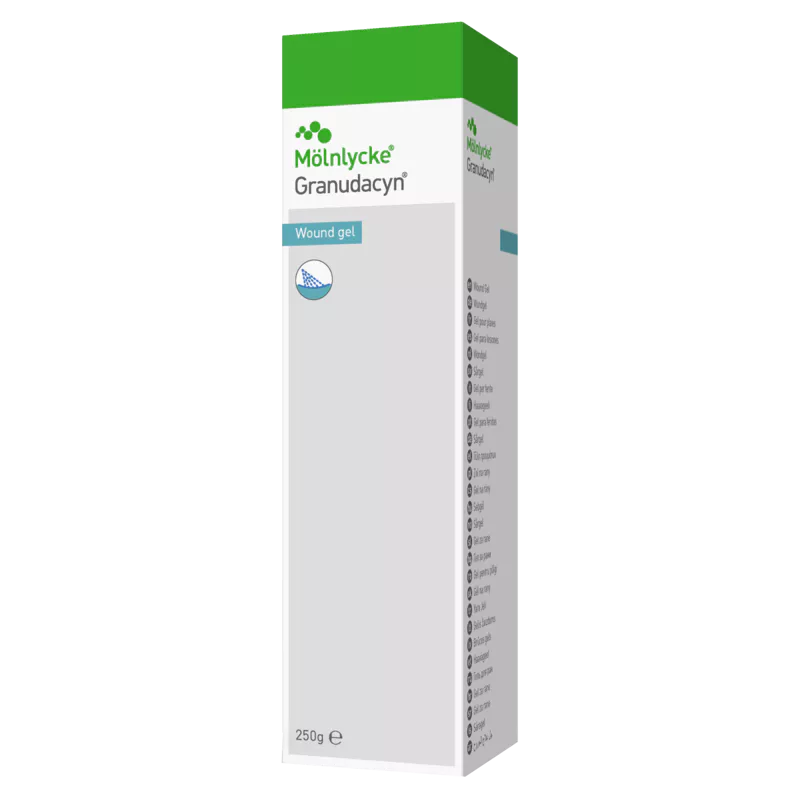 Granudacyn® to gotowy do użycia żel do oczyszczania i nawilżania ran przewlekłych, ostrych, chirurgicznych i zanieczyszczonych, a także oparzeń pierwszego i drugiego stopnia. Może być również stosowany na wrażliwe tkanki, takie jak chrząstki, ścięgna, więzadła i kości lub w uchu, jamie ustnej, ranach chirurgicznych (śródoperacyjnych i pooperacyjnych) oraz przetokach. Granudacyn należy nanieść na łożysko rany przed jej oczyszczeniem. Roztwór nie wymaga neutralizacji ani spłukiwania i może być stosowany do nawilżania opatrunku na ranę oraz samej rany. Kwas podchlorawy (HOCl) zapewnia trwałość roztworu i sprawia, że Granudacyn żel na rany jest skutecznym roztworem do płukania ran. HOCl zapobiega namnażaniu się bakterii Gram+ i Gram-, w tym MRSA, ORSA, VRSA, VRE, wirusów, grzybów i przetrwalników. Granudacyn przeznaczony jest do użytku przez wielu pacjentów przez 90 dni po otwarciu. Bezpieczeństwo użytkowania po otwarciu zapewnia konserwant jakim jest kwas podchlorawy – substancja naturalnie występująca w ludzkim organizmie.