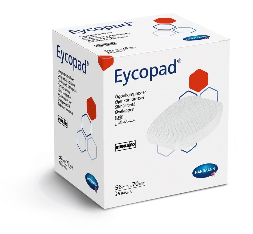 Opatrunek oczny Eycopad® jest dedykowany do stosowania jako opatrunek ochronny dla ran ocznych. Idealnie nadaje się do pokrywania i ochrony delikatnej skóry wokół oczu oraz innych obszarów okołookularowych. Kompres oczny wykonany z wysokogatunkowej waty opatrunkowej. Opatrunek wykonany z wysokogatunkowej waty opatrunkowej z otuliną gazową z czystej bawełny. Produkt jest sterylny, służy do jednorazowego użytku. Jest niezwykle miękki oraz chłonny. Oferuje dobre właściwości wyściełające, zapewniając optymalne warunki dla procesu gojenia się rany ocznej.