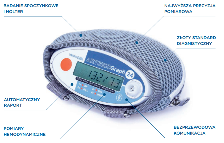 System do długotrwałego monitorowania centralnego ciśnienia tętniczego oraz złożonej diagnostyki stanu naczyń krwionośnych ArterioGraph24 jest to nowoczesny Holter służący do diagnostyki stanu naczyń krwionośnych. Wyjątkowa technologia w urządzeniu umożliwia pomiar podstawowych parametrów, ale również zaawansowanej hemodynamiki przez 24 godziny.